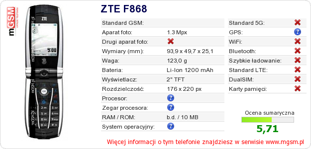 Dane telefonu ZTE F868 na Twojej stronie