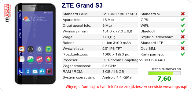 Dane telefonu ZTE Grand S3 na Twojej stronie