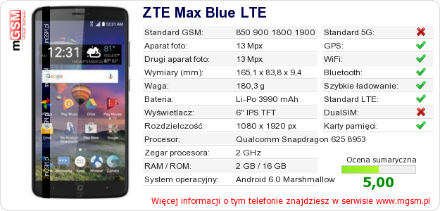 Dane telefonu ZTE Max Blue LTE na Twojej stronie