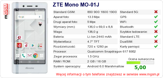 Dane telefonu ZTE Mono MO-01J na Twojej stronie