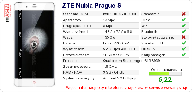 Dane telefonu ZTE Nubia Prague S na Twojej stronie