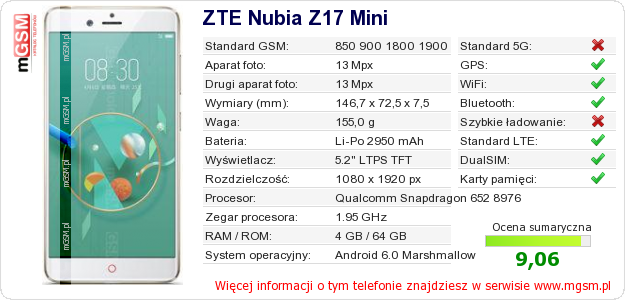 Dane telefonu ZTE Nubia Z17 Mini na Twojej stronie
