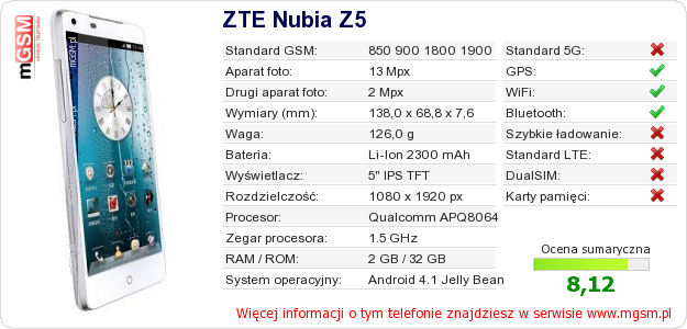 Dane telefonu ZTE Nubia Z5 na Twojej stronie