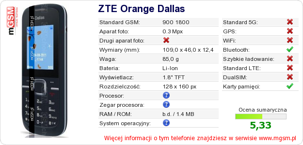 Dane telefonu ZTE Orange Dallas na Twojej stronie