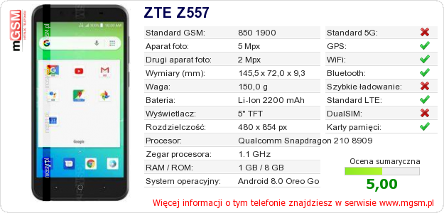 Dane telefonu ZTE Z557 na Twojej stronie
