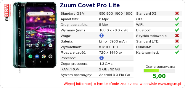 Dane telefonu Zuum Covet Pro Lite na Twojej stronie